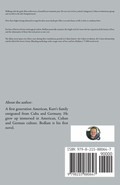 Walking with the gods, Elias rediscovers a beautiful yet traumatic past. He was once in love, joined a dangerous Cuban revolutionary group and was left to die after bring betrayed. Now these higher beings demand revenge but does more death give Elias a second chance at life or does it condemn him? For fans of literary fiction and magical realism. Bedlam poetically examines the fragile soul of a man who has experienced the beauty of love and the inhumanity of those that seek power at any cost. The debut novel spans over thirty years during three tumultuous periods in Cuban history: the Cuban revolution, the Castro dictatorship and the fall of the Soviet Union. Blending mythology with a tragic story of love and loss, Bedlam is a 77,000-word novel. Excerpt 1: Ignacio's cheeks rose in disgust as he knelt to leer straight into my eyes. "What are you looking at you dirty thing?" At that moment, I wasn't interested in engaging him, instead, I was too distracted. That strange erratic light had now come closer. The size of a baseball, the orb moved like a wild bumble bee just twenty feet away. It fluttered to and fro, up and over as it streamed across the palm trees, floor and sky. Was it a large firefly? A group of fireflies? Stranger yet, it seemed like I was the only one distracted by its presence. Everyone else ignored the pulsating orb while it repeatedly, and hectically, flew right past or hovered near them. At an angle above the water it suddenly stopped. The object spiraled and turned in place until it grew still. For some reason, I got the feeling that it was staring right at me. Eventually, I became more certain as it slowly moved in my direction. Excerpt 2: For you see, my muse is pink hair bouncing off the sun. Tender kisses that hum'" I love you," long after they're gone. It's a song, a beat, a rhythm. It's a butterfly that speaks pigeon in a world full of penguins. Mine is the fantastic; it's the world when it skips a beat: click, click, ti-click. And me? All I wanted was to rip you away, steal you from some beautiful reverie only to see the expression I must have had so long ago. About the author: A first generation American, Kurt's family emigrated from Cuba and Germany. He grew up immersed in American, Cuban and German culture. Bedlam is his first novel.