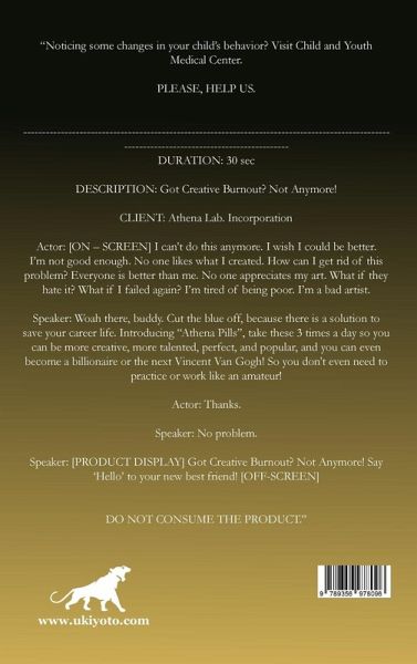 Noticing some changes in your child's behavior? Visit Child and Youth Medical Center. PLEASE, HELP US. ---------------------------------------------------------------------------------------------------------------------------------------------- DURATION: 30 sec DESCRIPTION: Got Creative Burnout? Not Anymore! CLIENT: Athena Lab. Incorporation Actor: [ON - SCREEN] I can't do this anymore. I wish I could be better. I'm not good enough. No one likes what I created. How can I get rid of this problem? Everyone is better than me. No one appreciates my art. What if they hate it? What if I failed again? I'm tired of being poor. I'm a bad artist. Speaker: Woah there, buddy. Cut the blue off, because there is a solution to save your career life. Introducing "Athena Pills", take these 3 times a day so you can be more creative, more talented, perfect, and popular, and you can even become a billionaire or the next Vincent Van Gogh! So you don't even need to practice or work like an amateur! Actor: Thanks. Speaker: No problem. Speaker: [PRODUCT DISPLAY] Got Creative Burnout? Not Anymore! Say 'Hello' to your new best friend! [OFF-SCREEN] DO NOT CONSUME THE PRODUCT.