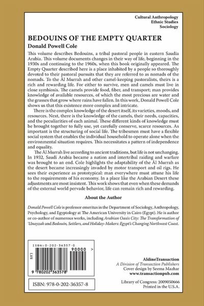 This volume describes Bedouins, a tribal pastoral people in eastern Saudia Arabia. This volume documents changes in their way of life, beginning in the 1930s and continuing to the 1960s, when this book originally appeared. The Empty Quarter described here is a place inhabited by a people so thoroughly devoted to their pastoral pursuits that they are referred to as nomads of the nomads. To the Al Murrah and other camel-keeping pastoralists, theirs is a rich and rewarding life. For either to survive, men and camels must live in close symbiosis. The camels provide food, fiber, and transport; man provides knowledge of available resources, of which the most precious are water and the grasses that grow where rains have fallen. In this work, Donald Powell Cole shows us that this existence more complex and intricate. There is the complex knowledge of the desert itself, its varieties, moods, and resources. Next, there is the knowledge of the camels, their needs, capacities, and the peculiarities of each animal. These different kinds of knowledge must be brought together to fully use, yet carefully conserve, scarce resources. As important is the structuring of social life. The tribesmen must have a flexible social system that enables the individual household to operate alone when the environmental situation requires. This necessitates a pattern of independence and equality. The Al Murrah live according to ancient traditions, but life is not unchanging. In 1932, Saudi Arabia became a nation and intertribal raiding and warfare was brought to an end. Cole highlights the adaptability of the Al Murrah as the desert became increasingly invaded by motor transport and oil rigs. He sees their experience as prototypical: man everywhere must attune his life to the requirements of his economy. In a place like the Arabian Desert these adjustments are most insistent. This work shows that even when these demands of the external world pervade behavior, life can remain rich and rewarding.