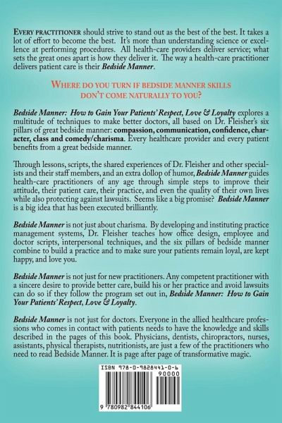 Bedside Manner: How to Gain Your Patients' Respect, Love & Loyalty is the definitive textbook on bedside manner. This book teaches all healthcare providers how to manage the needs, wants and fears of their patients. Bedside Manner explores a multitude of techniques to make better doctors, all based on Dr. Fleisher's six pillars of great bedside manner: compassion, communication, confidence, character, class and comedy/charisma. Every healthcare provider and every patient benefits from a great bedside manner. Through lessons, scripts, the shared experiences of Dr. Fleisher and other specialists and their staff members, and an extra dollop of humor, Bedside Manner guides health-care practitioners of any age through simple steps to improve their attitude, their patient care, their practice, and even the quality of their own lives while also protecting against lawsuits. Seems like a big promise? Bedside Manner is a big idea that has been executed brilliantly. Bedside Manner is not just about charisma. By developing and instituting practice management systems, Dr. Fleisher teaches how office design, employee and doctor scripts, interpersonal techniques, and the six pillars of bedside manner combine to build a practice and to make sure your patients remain loyal, are kept happy, and love you. Bedside Manner is not just for new practitioners. Any competent practitioner with a sincere desire to provide better care, build his or her practice and avoid lawsuits can do so if they follow the program set out in, Bedside Manner: How to Gain Your Patients' Respect, Love & Loyalty. Bedside Manner is not just for doctors. Everyone in the allied healthcare professions who comes in contact with patients needs to have the knowledge and skills described in the pages of this book. Physicians, dentists, chiropractors, nurses, assistants, physical therapists, nutritionists, are just a few of the practitioners who need to read Bedside Manner. It is page after page of transformative magic.