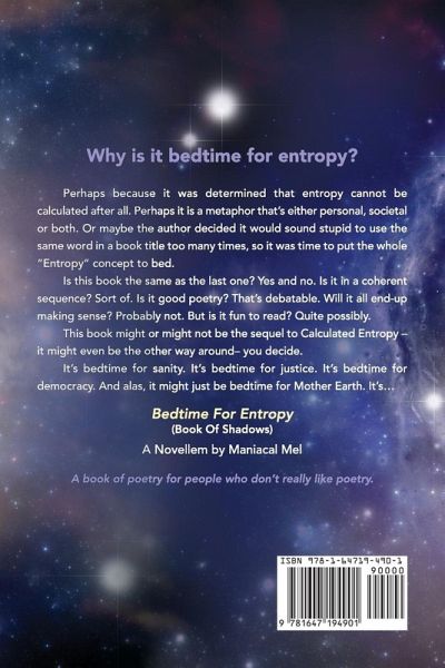 A book of poetry for people who don't really like poetry. Why is it bedtime for entropy? Perhaps because it was determined that entropy cannot be calculated after all. Perhaps it is a metaphor that's either personal, societal or both. Or maybe the author decided it would sound stupid to use the same word in a book title too many times, so it was time to put the whole "Entropy" concept to bed. Is this book the same as the last one? Yes and no. Is it in a coherent sequence? Sort of. Is it good poetry? That's debatable. Will it all end-up making sense? Probably not. But is it fun to read? Quite possibly. This book might or might not be the sequel to Calculated Entropy -it might even be the other way around-you decide. It's bedtime for sanity. It's bedtime for justice. It's bedtime for democracy. And alas, it might just be bedtime for Mother Earth. It's...