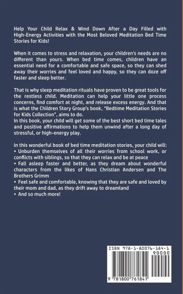 Help Your Child Relax & Wind Down After a Day Filled with High-Energy Activities with the Most Beloved Meditation Bed Time Stories for Kids! When it comes to stress and relaxation, your children's needs are no different than yours. When bed time comes, children have an essential need for a comfortable and safe space, so they can shed away their worries and feel loved and happy, so they can doze off faster and sleep better. That is why sleep meditation rituals have proven to be great tools for the restless child. Meditation can help your little one process concerns, find comfort at night, and release excess energy. And that is what the Children Story Group's book, "Bedtime Meditation Stories for Kids Collection", aims to do. In this book, your child will get some of the best short bed time tales and positive affirmations to help them unwind after a long day of stressful, or high-energy play. In this wonderful book of bed time meditation stories, your child will:Unburden themselves of all their worries from school work, or conflicts with siblings, so that they can relax and be at peace Fall asleep faster and better, as they dream about wonderful characters from the likes of Hans Christian Andersen and The Brothers Grimm Feel safe and comfortable, knowing that they are safe and loved by their mom and dad, as they drift away to dreamland And so much more! Children love a great story. At their age, they are naturally curious and always follow a story to its end. So, why not make bed time even more relaxing by reading the "Bedtime Meditation Stories for Kids Collection"!