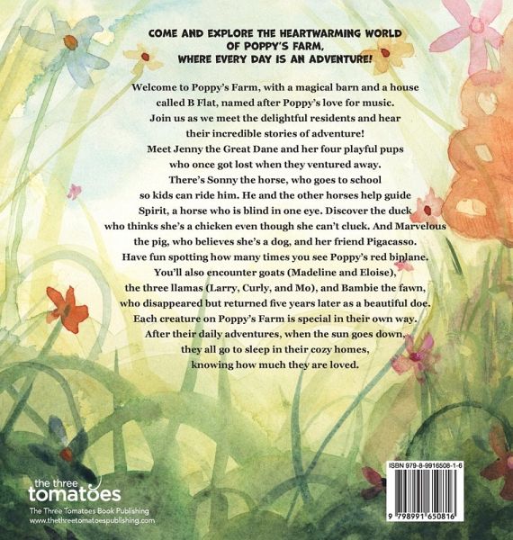 Come and explore the heartwarming world of Poppy's Farm, where every day is an adventure! Welcome to Poppy's farm, with a magical barn and a house called B Flat, named after Poppy's love of music. Join us as we meet the delightful residents and hear their incredible stories of adventure! Meet Jenny the Great Dane and her four playful pups who once got lost when they ventured away. There's Sonny the horse, who goes to school so kids can ride him. He and the other horses help guide Spirit, a horse who is blind in one eye. Discover the duck who thinks she's a chicken even though she can't cluck, and Marvelous the pig, who believes she's a dog, and her friend Pigacasso. Have fun spotting how many times you see Poppy's red biplane. You'll also encounter goats (Madeline and Eloise), the three llamas (Larry, Curly, and Mo), and Bambie the fawn, who disappeared but returned five years later as a beautiful doe. Each creature on Poppy's farm is special in their own way. After their daily adventures, when the sun goes down, they all go to sleep in their cozy homes, knowing how much they are loved.