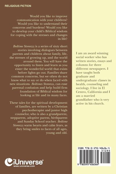 Would you like to improve communication with your children? Would you like to understand their concerns and burdens? Would you like to develop your child's Biblical wisdom for coping with the stresses and changes in life? Bedtime Storeezzz is a series of sixty short stories involving dialogues between parents and children about family, life, the stresses of growing up, and the world around them. You will have the opportunity to listen and learn as you enter the wonderful world that exists before lights go out. Families share common concerns, but we often do not know what to say or do when faced with new situations. Bedtimes Storeezzz, can ease parental confusion and help build firm foundation of Biblical wisdom for looking at life and its many faces. These tales for the spiritual development of families, are written by a Christian psychotherapist and junior high counselor, who is also a grandparent, stepparent, adoptive parent, birthparent and Sunday School teacher. Bedtime Storeezzz warm hearts and calm fears, as they bring smiles to faces of all ages, young and old.