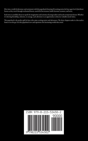 Dive into a world of adventure and excitement with this paperback featuring 50 exciting stories for boys ages 6 to 8. Join brave heroes as they travel through enchanted forests, search for lost treasure, battle fearsome creatures, and more. Each story is carefully chosen to spark the imagination and curiosity of young readers and teach an important lesson. Whether it's showing friendship, cohesion, or courage, each adventure is an opportunity to discover valuable moral values. This paperback is the perfect gift for boys who enjoy exciting stories and adventures. The short chapters make it a fun read at home or on the go. Get this paperback now and experience the fascinating worlds that await!