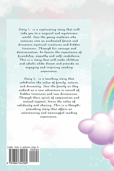 Story 1: is a captivating story that will take you to a magical and mysterious world. Join the young explorer who ventures into an enchanted forest and discovers mystical creatures and hidden treasures. He learns the importance of friendship, empathy, and self-confidence through courage and determination. This story will make children and adults dream and provide an engaging and inspiring reading experience. Story 2: is a touching story that celebrates the value of family, nature, and discovery. Join the family as they embark on a new adventure, searching for hidden treasures and discoveries. Through their spirit of cooperation and mutual support, they learn the value of solidarity and sharing. This is a thought-provoking story that offers an entertaining and meaningful reading experience. An exciting collection of two original stories that inspire curiosity, creativity, and a love of nature. Full-color illustrations make the stories more engaging and stimulating for children's imaginations. Two engaging stories are about adventures, discoveries, and how nature can provide moments of happiness and surprise. Recommended for children between the ages of 5 and 10, but suitable for anyone who loves stories that make them daydream. A perfect book to read with your children and to share moments of relaxation and fun with the family. Ideal for reading before bedtime to give children happy dreams and fantastic adventures. A book that encourages children to discover the beauty of nature and respect it, promoting values of caring for the environment and love for animals.