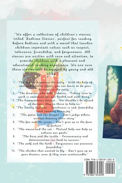 "We offer a collection of children's stories titled 'Bedtime Stories', perfect for reading before bedtime and with a moral that teaches children important values such as respect, tolerance, friendship, and forgiveness. All stories are written with care and attention to provide children with a pleasant and educational reading experience. We are sure these stories will be enjoyed by young and old alike!" ¿¿¿"The beaver discovers the potty - With the help of mom and a little effort, you can learn to do your business in the potty." "The dinosaur who didn't shower - Taking care to wash is important for our health and well-being." "The hippopotamus dentist - We shouldn't be afraid of doctors; they're there to help us." "The Lonely Sparrow - Loneliness is sad, friendship and company bring joy." "The goose and the dragon - Don't judge others without knowing their story." "The fox and the grape - Don't give up in the face of failure." "The mouse and the cat - Mutual help can help us achieve our goals." "The hare and the turtle - Perseverance, and determination can lead to success." "The wolf and the lamb - Forgiveness can preserve a friendship." "The chicken that wanted to fly - Don't give up on your dreams, even if they seem unattainable."