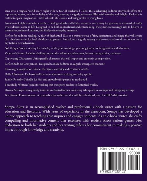 Dive into a magical world every night with A Year of Enchanted Tales! This enchanting bedtime storybook offers 365 captivating stories, one for each day of the year, ensuring a nightly adventure filled with wonder and delight. Each tale is crafted to spark imagination, instill valuable life lessons, and bring smiles to young faces. From brave knights and wise wizards to talking animals and hidden treasures, every story is a gateway to a fantastical realm where dreams come to life. Designed to be both motivational and entertaining, these stories encourage kids to believe in themselves, embrace kindness, and find joy in everyday moments. Perfect for bedtime reading, A Year of Enchanted Tales is a treasure trove of fun, inspiration, and magic that will create cherished memories for both children and parents. Embark on a nightly journey of discovery and wonder-because every day holds a new adventure! 365 Unique Stories: A story for each day of the year, ensuring a year-long journey of imagination and adventure. Variety of Genres: Includes thrilling horror tales, whimsical adventures, heartwarming stories, and more. Captivating Characters: Unforgettable characters that will inspire and entertain young readers. Perfect Bedtime Companion: Designed to make bedtime an eagerly anticipated moment. Encourages Imagination: Stories that ignite curiosity and creativity in kids. Daily Adventure: Each story offers a new adventure, making every day special. Family-Friendly: Suitable for kids and enjoyable for parents to read aloud. Beautifully Written: Vivid storytelling that transports readers to fantastical worlds. Diverse Settings: From ghostly trains to enchanted forests, each story takes place in a unique and intriguing setting. Year-Round Entertainment: A comprehensive collection that will be a cherished part of a child's daily routine.
