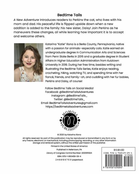 Bedtime Tails: A New Adventure introduces readers to Perkins the cat, who lives with his mom and dad. His peaceful life is flipped upside down when a new addition is added to the family: his new sister, Daisy! Join Perkins as he maneuvers these changes, all while learning how important it is to accept and welcome others. This is the first in the Bedtime Tails Series.