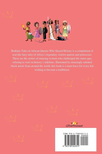 Let Us Educate Our Children About Africa's Glorious History "Bedtime Tales of African Queens Who Slayed History" is an illustrated children's book featuring 33 African Warrior Queens. These stories are lovingly written in a fairy tale style, making it easy for every kid to immediately dive deep into the magical and wonderful universe of these extraordinary women who changed history forever. This is a book to learn about the adventures of Africa's true legendary queens. Women who challenged the status quo, refusing to wait on history's sidelines. Discover the stories of heroes such as: Queen Ndata Yalla of Senegal Queen mother Yaa Asantewaa of Ghana Queen Araweelo of Somalia Queen Amanirenas of Kush (Sudan) Empress Lili'uokalani of Hawaii Queen Amina of Nigeria Queen Njinga of Angola Not only will "Bedtime Tales of African Queens Who Slayed History" help inspire little girls to dream bigger, it is also a collection of wonderful art created by amazingly talented black illustrators around the world. The intention here is to shine a spotlight on black artists who are most often overlooked.This is the ideal bedside book for every kid. 33 real-life fairy tales of women who changed history. Designed to help children learn more about their past, A book that celebrates courage, wisdom, determination, love and more.