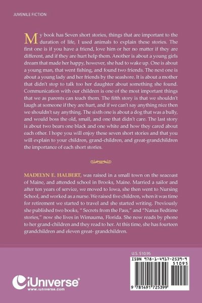 My book has Seven short stories, things that are important to the duration of life, I used animals to explain these stories. The first one is if you have a friend, love him or her no matter if they are different, and if they are hurt help them. Another is about a young girls dream that made her happy, however, she had to wake up. One is about a young man, that went fishing, and found two friends. The next one is about a young lady and her friends by the seashore. It is about a mother that didn't stop to talk too her daughter about something she found. Communication with our children is one of the most important things that we as parents can teach them. The fifth story is that we shouldn't laugh at someone if they are hurt, and if we can't say anything nice then we shouldn't say anything. The sixth one is about a dog that was a bully, and would boss the old, small, and one that didn't care. The last story is about two bears one black and one white and how they cared about each other. I hope you will enjoy these seven short stories and that you will explain to your children, grand-children, and great-grandchildren the importance of each short stories.