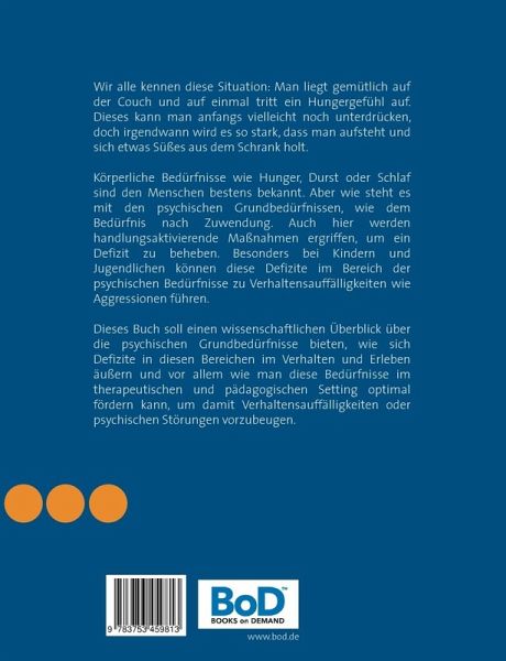 Wir alle kennen diese Situation: Man liegt gemütlich auf der Couch und auf einmal tritt ein Hungergefühl auf. Dieses kann man anfangs vielleicht noch unterdrücken, doch irgendwann wird es so stark, dass man aufsteht und sich etwas Süßes aus dem Schrank holt. Körperliche Bedürfnisse wie Hunger, Durst oder Schlaf sind den Menschen bestens bekannt. Aber wie steht es mit den psychischen Grundbedürfnissen, wie dem Bedürfnis nach Zuwendung. Auch hier werden handlungsaktivierende Maßnahmen ergriffen, um ein Defizit zu beheben. Besonders bei Kindern und Jugendlichen können diese Defizite im Bereich der psychischen Bedürfnisse zu Verhaltensauffälligkeiten wie Aggressionen führen. Dieses Buch soll einen wissenschaftlichen Überblick über die psychischen Grundbedürfnisse bieten, wie sich Defizite in diesen Bereichen im Verhalten und Erleben äußern und vor allem wie man diese Bedürfnisse im therapeutischen und pädagogischen Setting optimal fördern kann, um damit Verhaltensauffälligkeiten oderpsychischen Störungen vorzubeugen.