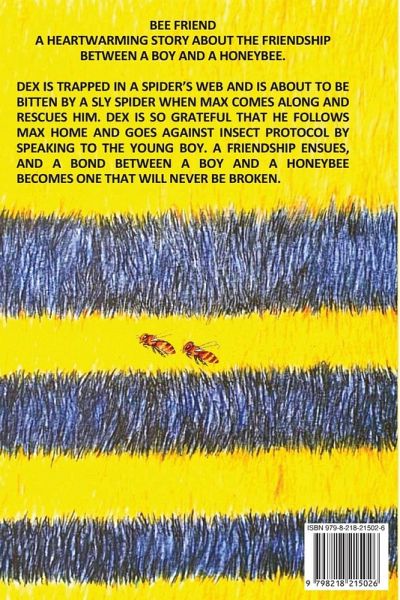 Bee Friend is a heartwarming story about the friendship between a boy and a honeybee. Dex is trapped in a spider's web and is about to be bitten by a sly spider when Max comes along and rescues him. Dex is so grateful that he follows Max home and goes against insect protocol by speaking to the young boy. A friendship ensues, and a bond between a boy and a honeybee becomes one that will never be broken. This story will delight young readers! They will experience a journey alongside Max and Dex while learning about bees and other insects.