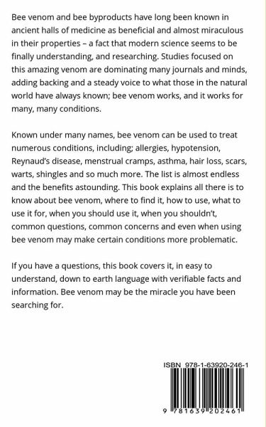 Bee venom and bee byproducts have long been known in ancient halls of medicine as beneficial and almost miraculous in their properties - a fact that modern science seems to be finally understanding, and researching. Studies focused on this amazing venom are dominating many journals and minds, adding backing and a steady voice to what those in the natural world have always known; bee venom works, and it works for many, many conditions. Known under many names, bee venom can be used to treat numerous conditions, including; allergies, hypotension, Reynaud's disease, menstrual cramps, asthma, hair loss, scars, warts, shingles and so much more. The list is almost endless and the benefits astounding. This book explains all there is to know about bee venom, where to find it, how to use, what to use it for, when you should use it, when you shouldn't, common questions, common concerns and even when using bee venom may make certain conditions more problematic. If you have a questions, this book covers it, in easy to understand, down to earth language with verifiable facts and information. Bee venom may be the miracle you have been searching for.