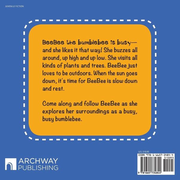 BeeBee the bumblebee is busy-and she likes it that way! She buzzes all around, up high and up low. She visits all kinds of plants and trees. BeeBee just loves to be outdoors. When the sun goes down, it's time for BeeBee is slow down and rest. Come along and follow BeeBee as she explores her surroundings as a busy, busy bumblebee.