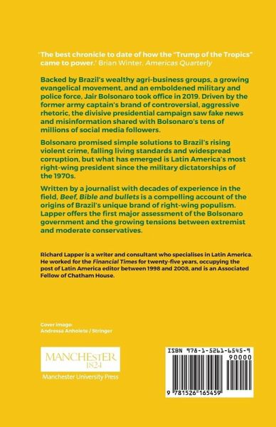 Backed by Brazils wealthy agribusiness groups, a growing evangelical movement, and an emboldened military and police force, Jair Bolsonaro took office in 2019. Driven by the former army captains brand of controversial, aggressive rhetoric, the divisive presidential campaign saw fake news and misinformation shared with Bolsonaros tens of millions of social media followers. Bolsonaro promised simple solutions to Brazils rising violent crime, falling living standards and widespread corruption, but what has emerged is Latin America's most right-wing president since the military dictatorships of the 1970s. Famous for his racist, homophobic and sexist beliefs and his disregard for human rights, the so-called Trump of the Tropics has established a reputation based on his polemical, sensationalist statements. Written by a journalist with decades of experience in the field, Beef, Bible and bullets is a compelling account of the origins of Brazil's unique brand of right-wing populism. Lapper offers the first major assessment of the Bolsonaro government and the growing tensions between extremist and moderate conservatives.