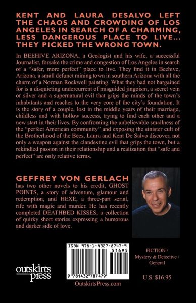 In BEEHIVE ARIZONA, a Geologist and his wife, a successful Journalist, forsake the crime and congestion of Los Angeles in search of a "safer, more perfect" place to live. They find it in Beehive, Arizona, a small defunct mining town in southern Arizona with all the charm of a Norman Rockwell painting. What they had not bargained for is a disquieting undercurrent of misguided jingoism, a secret vein or silver and a supernatural evil that grips the minds of the town's inhabitants and reaches to the very core of the city's foundation. It is the story of a couple, lost in the middle years of their marriage, childless and with hollow success, trying to find each other and a new start in their lives. By confronting the unbelievable smallness of the "perfect American community" and exposing the sinister cult of the Brotherhood of the Bees, Laura and Kent De Salvo discover, not only a weapon against the clandestine evil that grips the town, but a rekindled passion in their relationship and a realization that "safe and perfect" are only relative terms.
