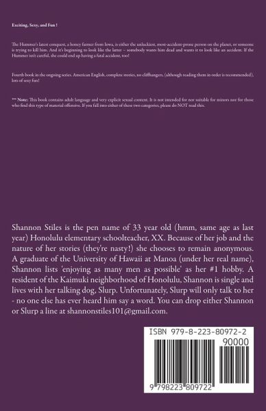 Exciting, Sexy, and Fun ! The Hummer's latest conquest, a honey farmer from Iowa, is either the unluckiest, most-accident-prone person on the planet, or someone is trying to kill him. And it's beginning to look like the latter - somebody wants him dead and wants it to look like an accident. If the Hummer isn't careful, she could end up having a fatal accident, too! Fourth book in the ongoing series. American English, complete stories, no cliffhangers, (although reading them in order is recommended), lots of sexy fun! *** Note: This book contains adult language and very explicit sexual content. It is not intended for nor suitable for minors nor for those who find this type of material offensive. If you fall into either of these two categories, please do NOT read this.