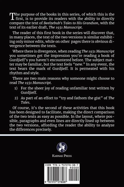 This is the first in a series of 3 books that provide the reader with the ability to directly compare the text of Beelzebub's Tales to His Grandson with the text of its earlier draft, The 1931 Manuscript.