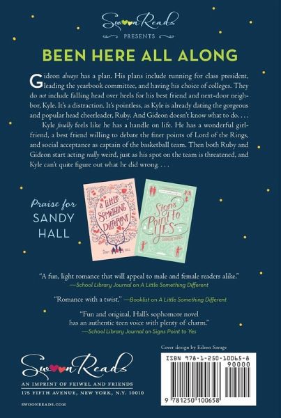 From the author of A Little Something Different comes a quirky, heartfelt novel about high school, first love, and what happens when the plans you make for yourself go just a little bit awry. Gideon always has a plan. His plans include running for class president, leading the yearbook committee, and having his choice of colleges. They do not include falling head over heels for his best friend and next-door neighbor, Kyle. It's a distraction. It's pointless, as Kyle is already dating the gorgeous and popular head cheerleader, Ruby. And Gideon doesn't know what to do... Kyle finally feels like he has a handle on life. He has a wonderful girlfriend, a best friend willing to debate the finer points of Lord of the Rings, and social acceptance as captain of the basketball team. Then both Ruby and Gideon start acting really weird, just as his spot on the team is threatened, and Kyle can't quite figure out what he did wrong... Author Sandy Hall's signature wit and charm is back with Been Here All Along, an LGBT young adult romance from Macmillan's young adult imprint Swoon Reads. Praise for Been Here All Along: "It's sweet. It's adorable. It's full of emotions. It's one of the best romances I've ever read, and I'll be reading this one again multiple times." -Here's to Happy Endings " If you're a fan of cute YA romance, this book will hit the spot." -Feed Your Fiction Addiction "Atmospheric and heart-warming . . . " -Hit Or Miss Books