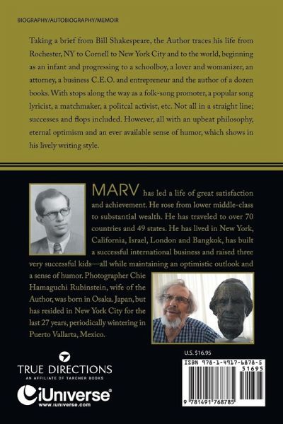 Taking a brief from Bill Shakespeare, the Author traces his life from Rochester, NY to Cornell to New York City and to the world, beginning as an infant and progressing to a schoolboy, a lover and womanizer, an attorney, a business C.E.O. and entrepreneur and the author of a dozen books. With stops along the way as a folk-song promoter, a popular song lyricist, a matchmaker, a politcal activist, etc. Not all in a straight line; successes and flops included. However, all with an upbeat philosophy, eternal optimism and an ever available sense of humor, which shows in his lively writing style.