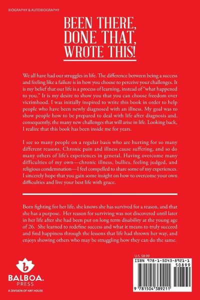 We all have had our struggles in life. The difference between being a success and feeling like a failure is in how you choose to perceive your challenges. It is my belief that our life is a process of learning, instead of "what happened to you." It is my desire to show you that you can choose freedom over victimhood. I was initially inspired to write this book in order to help people who have been newly diagnosed with an illness. My goal was to show people how to be prepared to deal with life after diagnosis and, consequently, the many new challenges that will arise in life. Looking back, I realize that this book has been inside me for years. I see so many people on a regular basis who are hurting for so many different reasons. Chronic pain and illness cause suffering, and so do many others of life's experiences in general. Having overcome many difficulties of my own-chronic illness, bullies, feeling judged, and religious condemnation-I feel compelled to share some of my experiences. I sincerely hope that you gain some insight on how to overcome your own difficulties and live your best life with grace.