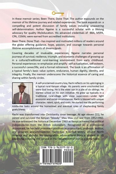 In this memoir series; Been There, Done That: The author expounds on the memoir of his lifetime journey and related experiences. The book expands on a compelling and potent discussion of family values including unwavering self-determination. Author Ngaine is a successful scholar with a lifelong advocacy for quality life/education. His advanced credentials of BBA, MSPA, CPA, CGMA; were earned from accredited institutions. Been There. Done That---has inspired and motivated millions of readers around the globe offering guidance, hope, passion, and courage towards personal lifetime accomplishments of dreams/goals. Covering decades of invaluable experiences, Ngaine narrates personal journeys of survival; resilience, triumph, and economic challenges of growing up in a cultural/traditional rural-learning environment from early childhood. Personal experiences re-emphasize and amplify self-actualization, self-esteem, a successful career/life, and a formal retirement. The book is an affirmation of a typical family's basic value system, endurance, human dignity, identity, and integrity. Finally, the memoir underscores the historical essence of caring and sharing within family circles.