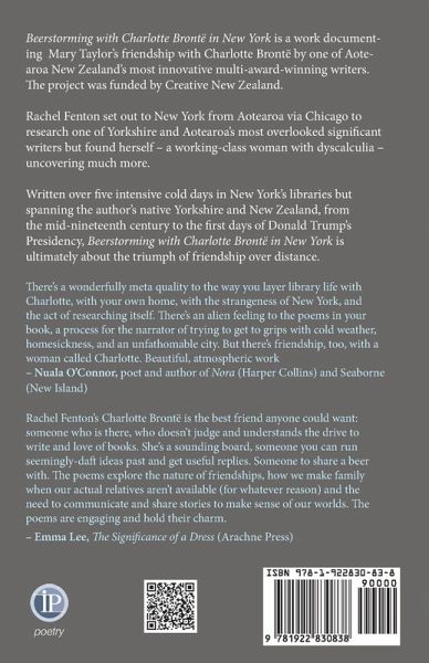 Beerstorming with Charlotte Brontë in New York is a work documenting Mary Taylor's friendship with Charlotte Brontë by one of Aotearoa New Zealand's most innovative multi-award-winning writers. The project was funded by Creative New Zealand. Rachel Fenton set out to New York from Aotearoa via Chicago to research one of Yorkshire and Aotearoa's most overlooked significant writers but found herself - a working-class woman with dyscalculia - uncovering much more. *** Written over five intensive cold days in New York's libraries but spanning the author's native Yorkshire and New Zealand, from the mid-nineteenth century to the first days of Donald Trump's Presidency, Beerstorming with Charlotte Brontë in New York is ultimately about the triumph of friendship over distance. There's a wonderfully meta quality to the way you layer library life with Charlotte, with your own home, with the strangeness of New York, and the act of researching itself. There's an alien feeling to the poems in your book, a process for the narrator of trying to get to grips with cold weather, homesickness, and an unfathomable city. But there's friendship, too, with a woman called Charlotte. Beautiful, atmospheric work - Nuala O'Connor, poet and author of Nora (Harper Collins) and Seaborne (New Island) Rachel Fenton's Charlotte Brontë is the best friend anyone could want: someone who is there, who doesn't judge and understands the drive to write and love of books. She's a sounding board, someone you can run seemingly-daft ideas past and get useful replies. Someone to share a beer with. The poems explore the nature of friendships, how we make family when our actual relatives aren't available (for whatever reason) and the need to communicate and share stories to make sense of our worlds. The poems are engaging and hold their charm. - Emma Lee, The Significance of a Dress (Arachne Press)