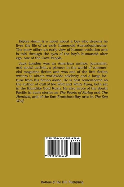 Before Adam is a novel about a boy who dreams he lives the life of an early humanoid Australopithecine. The story offers an early view of human evolution and is told through the eyes of the boy's humanoid alter ego, one of the Cave People. Jack London was an American author, journalist, and social activist, a pioneer in the world of commercial magazine fiction and was one of the first fiction writers to obtain worldwide celebrity and a large fortune from his fiction alone. He is best remembered as the author of Call of the Wild and White Fang, both set in the Klondike Gold Rush. He also wrote of the South Pacific in such stories as The Pearls of Parlay and The Heathen, and of the San Francisco Bay area in The Sea Wolf.