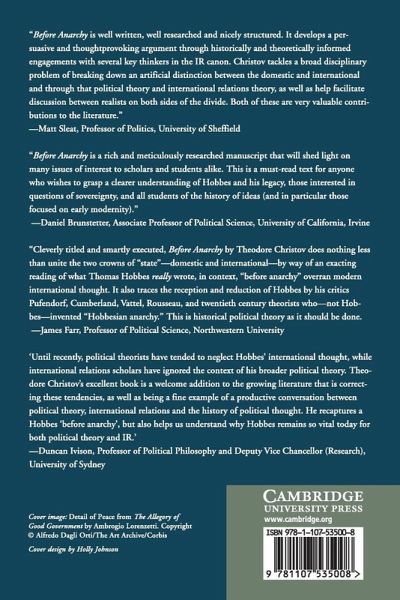 How did the 'Hobbesian state of nature' and the 'discourse of anarchy' - separated by three centuries - come to be seen as virtually synonymous? Before Anarchy offers a novel account of Hobbes's interpersonal and international state of nature and rejects two dominant views. In one, international relations is a warlike Hobbesian anarchy, and in the other, state sovereignty eradicates the state of nature. In combining the contextualist method in the history of political thought and the historiographical method in international relations theory, Before Anarchy traces Hobbes's analogy between natural men and sovereign states and its reception by Pufendorf, Rousseau and Vattel in showing their intellectual convergence with Hobbes. Far from defending a 'realist' international theory, the leading political thinkers of early modernity were precursors of the most enlightened liberal theory of international society today. By demolishing twentieth-century anachronisms, Before Anarchy bridges the divide between political theory, international relations and intellectual history.