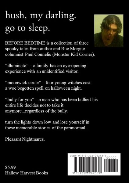 BEFORE BEDTIME is a collection of three spooky tales by author and Rue Morgue columnist Paul Counelis (Monster Kid Corner). "Illuminate" - A family has an eye-opening experience with an unidentified visitor. "Moonwick Circle" - Four young witches cast a woe begotten spell on Halloween night. "Bully For You" - A man who has been bullied his entire life decides not to take it anymore...regardless of the bully. Turn the lights down low and lose yourself in these memorable stories of the paranormal. Pleasant nightmares!