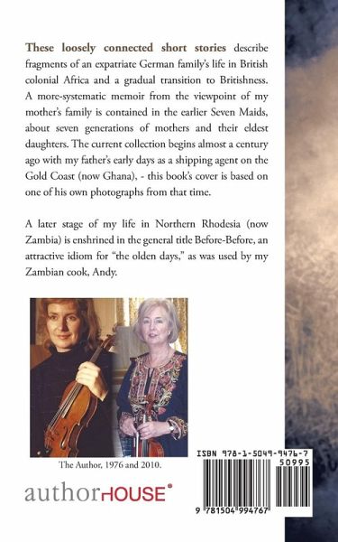These loosely connected short stories describe fragments of an expatriate German family's life in British colonial Africa and a gradual transition to Britishness. A more-systematic memoir from the viewpoint of my mother's family is contained in the earlier Seven Maids, about seven generations of mothers and their eldest daughters. The current collection begins almost a century ago with my father's early days as a shipping agent on the Gold Coast (now Ghana), - this book's cover is based on one of his own photographs from that time. A later stage of my life in Northern Rhodesia (now Zambia) is enshrined in the general title Before-Before, an attractive idiom for "the olden days," as was used by my Zambian cook, Andy.