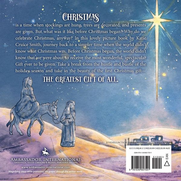 Christmas is a time when stockings are hung, trees are decorated, and presents are given. But what was it like before Christmas began? Why do we celebrate Christmas, anyway? In this lovely picture book by Katie Cruice Smith, journey back to a simpler time when the world didn't know what Christmas was. Before Christmas began, the world didn't know that we were about to receive the most wonderful, spectacular Gift ever to be given. Take a break from the hustle and bustle of the holiday season and take in the beauty of the first Christmas gift-the greatest Gift of all. "What a sweet, beautiful telling of our Savior's birth! I absolutely adore the colorful illustrations and catchy rhythmic text. This book seamlessly covers the account of Jesus' birth in Bethlehem and connects it to our current-day Christmas celebration, while also touching on Jesus' sacrifice for us. It keeps the real meaning of Christmas front and center in what has become a more materialistic season. I have no doubt that this delightful book will be a treasured keepsake for children and a family favorite read-aloud for parents. A must read for children of all ages!" -Karen Ferguson Author, Questions for Kids picture book series "This book is sweet, clever, and easy to read with information that allows you to converse with your child about the meaning of Christmas. The illustrations are beautiful, and the meaning is so clear." -Jennifer Campbell Doula in Reno Mom of eighteen "Before Christmas Began is a beautifully rhyming story of the birth of Jesus and best gift we could ever be given: Himself! This book will be a wonderful addition to Christmastime readings as we aim to focus our families on the true reason for Christmas." -Kelsie Detweiler author of God Made You, My Darling Boy and God Made You, My Darling Girl