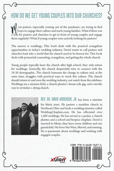 Most pastors, especially in the years following the pandemic, are searching for fresh ways to reach young families and re-engage their communities. But what if the key was already knocking on the church door? What if young couples were not just open to connection with pastors, but actively looking for them? The answer is weddings. In Before God and These Witnesses, Rev. Dr. David Anderson reveals the overlooked evangelism opportunities hidden in today's wedding industry. Far from being a mere ceremony, weddings can open doors to premarital counseling, gospel conversations, and long-term church relationships. Anderson calls pastors and churches to reclaim a space where the church was once central-and where it can be again. Young adults often leave the church after high school and only return for weddings. At the very moment churches struggle to connect with the 18-30 demographic, weddings provide a natural mission field. Instead of standing on the sidelines, churches can step in with hope, hospitality, and the gospel. Weddings can revitalize ministry, spark evangelism, and even breathe life into declining congregations. Drawing from more than thirty years of ministry-including over 1,800 weddings-Anderson offers both practical strategies and inspiring vision. Whether you are a pastor, church planter, or ministry leader, this book will equip you to see weddings not just as events, but as opportunities to reach a generation. Rev. Dr. David Anderson has served as a pastor and minister for more than thirty years. He is the founder of Wedding Chaplain, where he has officiated over 1,800 weddings and guided countless couples in preparing for marriage. David is also the host of The Wedding Chaplain Podcast, a practical and encouraging resource for engaged couples, and the author of Before God and These Witnesses, a book that equips churches to launch marriage ministries that strengthen families and communities. In addition to his ministry work, David pastors a thriving congregation in Ohio and speaks regularly on marriage, family, and leadership. He and his wife, Misty, share a blended family of seven children and three grandchildren, and their own story continues to shape his heart for helping others build strong, lasting marriages.