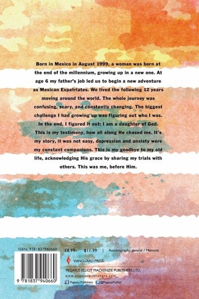 Born in Mexico in August 1999, a woman was born at the end of the millennium, growing up in a new one. At age 6 my father's job led us to begin a new adventure as Mexican Expatriates. We lived the following 12 years moving around the world. The whole journey was confusing, scary, and constantly changing. The biggest challenge I had growing up was figuring out who I was. In the end, I figured it out: I am a daughter of God. This is my testimony, how all along He chased me. It's my story, it was not easy, depression and anxiety were my constant companions. This is my goodbye to my old life, acknowledging His grace by sharing my trials with others. This was me, before Him.