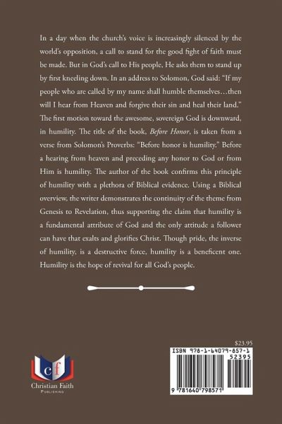 In a day when the church’s voice is increasingly silenced by the world’s opposition, a call to stand for the good fight of faith must be made. But in God’s call to His people, He asks them to stand up by first kneeling down. In an address to Solomon, God said: "If my people who are called by my name shall humble themselves…then will I hear from Heaven and forgive their sin and heal their land." The first motion toward the awesome, sovereign God is downward, in humility. The title of the book, Before Honor, is taken from a verse from Solomon’s Proverbs: "Before honor is humility." Before a hearing from heaven and preceding any honor to God or from Him is humility. The author of the book confirms this principle of humility with a plethora of Biblical evidence. Using a Biblical overview, the writer demonstrates the continuity of the theme from Genesis to Revelation, thus supporting the claim that humility is a fundamental attribute of God and the only attitude a follower can have that exalts and glorifies Christ. Though pride, the inverse of humility, is a destructive force, humility is a beneficent one. Humility is the hope of revival for all God’s people.