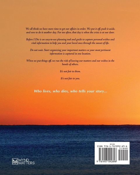 Death, with its profound finality and emotional weight, often catches us off guard, leaving survivors with a plethora of detailed tasks and decisions that must be made in the midst of grief and confusion. The heartfelt urgency that surrounds the topic of end-of-life planning and caring for aging parents or loved ones is the impetus for this guide. It's a subject that, for the most part, does not occupy much space in our daily thoughts. We tend to focus on the immediate tasks at hand rather than contemplating the inevitable end of life. Before I Die is a resource designed to capture your wishes and vital information to assist you and your loved ones through the sunset of life. While it may be more convenient to skip or avoid certain pages, it is imperative to take the time to ensure you have gathered the right information. This preparation can make all the difference in facing whatever challenges may come. When we put things off, we run the risk of leaving our matters and our wishes in the hands of others. It's not fair to them, and it's not fair to you. Before I Die includes:Personal Information Habits & Preferences Advance Care Planning Financial Information Insurance Information Medical History Home Evaluation & Environment Checklist