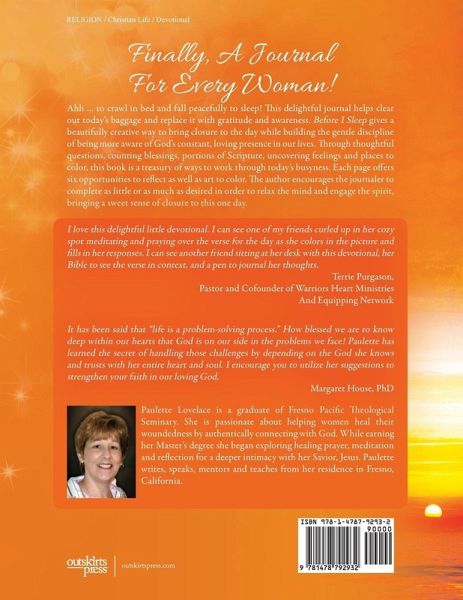 Ahh ... to crawl in bed and fall peacefully to sleep! This delightful journal helps clear out today's baggage and replace it with gratitude and awareness. Before I Sleep gives a beautifully creative way to bring closure to the day while building the gentle discipline of being more aware of God's constant, loving presence in our lives. Through thoughtful questions, counting blessings, portions of Scripture, uncovering feelings and places to color, this book is a treasury of ways to work through today's busyness. Each page offers six opportunities to reflect as well as art to color. The author encourages the journaler to complete as little or as much as desired in order to relax the mind and engage the spirit, bringing a sweet sense of closure to this one day. I love this delightful little devotional. I can see one of my friends curled up in her cozy spot meditating and praying over the verse for the day as she colors in the picture and fills in her responses. I can see another friend sitting at her desk with this devotional, her Bible to see the verse in context, and a pen to journal her thoughts. Terrie Purgason, Pastor and Cofounder of Warriors Heart Ministries And Equipping Network It has been said that "life is a problem-solving process." How blessed we are to know deep within our hearts that God is on our side in the problems we face! Paulette has learned the secret of handling those challenges by depending on the God she knows and trusts with her entire heart and soul. I encourage you to utilize her suggestions to strengthen your faith in our loving God. Margaret House, PhD