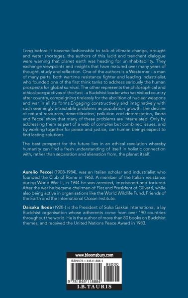 Long before it became fashionable to talk of climate change, drought and water shortages, the authors of this lucid and trenchant dialogue were warning that planet earth was heading for uninhabitability. They exchange viewpoints and insights that have matured over many years of thought, study and reflection. One of the authors is a Westerner - a man of many parts, both wartime resistance fighter and leading industrialist, who founded one of the first think tanks to address seriously the human prospects for global survival. The other represents the philosophical and ethical perspectives of the East - a Buddhist leader who has visited country after country, campaigning tirelessly for the abolition of nuclear weapons and war in all its forms.Engaging constructively and imaginatively with such seemingly intractable problems as population growth, the decline of natural resources, desertification, pollution and deforestation, Ikeda and Peccei show that many of these problems are interrelated. Only by addressing them as part of a web of complex but combined issues, and by working together for peace and justice, can human beings expect to find lasting solutions. The best prospect for the future lies in an ethical revolution whereby humanity can find a fresh understanding of itself in holistic connection with, rather than separation and alienation from, the planet itself.