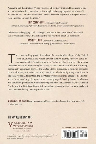 How the contours of the United States took shape--and what they might have been There was nothing predestined about the now-familiar shape of the United States of America. Early visions of what the new country's borders could encompass included Canadian provinces, Caribbean islands, and even Kamchatka in eastern Russia. In Before Manifest Destiny, Nicholas DiPucchio tells the surprising, dramatically contingent story of the United States' expansion, focusing in particular on the ultimately unrealized territorial ambitions cherished by many Americans in the early republic. Between the 1770s and 1820s, American expansionists made efforts to annex Bermuda, Upper Canada, Cuba, and vast swathes of the Pacific Northwest. As DiPucchio shows, however, local populations--from small groups of Caribbean merchants to Indigenous populations to rival imperial powers--contested their efforts, helping define the boundaries of the United States and forcing its leaders to recalibrate their expectations of the nation's growth. Rather than the relentless procession it may appear to be in retrospect, the story of early US expansion was in many ways defined by thwarted ambitions and unfulfilled possibilities. Halted in the Atlantic East, the Canadian North, and the Caribbean South, antebellum expansionists eventually declared it their manifest destiny to overspread the West.