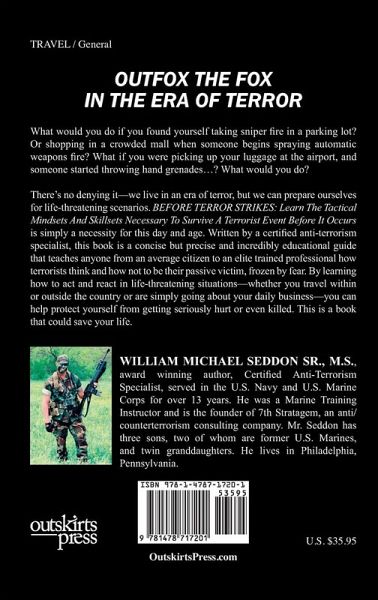 BEFORE TERROR STRIKES: Learn the Tactical Mindsets and Skillsets Necessary to Survive a Terrorist Event Before It Occurs is an insightful book that will be more likely, as opposed to less likely to keep you and your family alive while living in the era of terror. It is a wise resource that focuses on mitigating the risk of becoming a victim; a precise travel book that teaches you and your family how to develop tactical mindsets and skillsets, and anyone from an average citizen to an elite trained professional how to prevent, escape or defend against terrorist attacks while traveling in a civilized society. It teaches how not to be a passive "frozen-up" victim of the terrorist attack and survive by knowing how to act and react in many life-threatening situations while traveling in any city. What would you do if you found yourself in the parking lot and you started taking sniper fire? Or during Christmas holiday season you are shopping in a crowded mall, and someone begins spraying automatic weapons fire... Or you are picking up your luggage in a baggage claim area in the airport, and someone starts throwing hand grenades... What would you do? If you have never thought these and other similar scenarios through, you are most likely to react with recklessness by endangering yourself and all those around you, to freeze-up and become a helpless victim awaiting rescue. However, these eventual possibilities can be prevented by learning and applying the mindsets and skillsets this book teaches. Using this book as a self-help tactical training manual will allow you and your family to be among those who are less likely to get seriously hurt or killed in a life-threatening terror attack. Terrorist proverb states, "Why hunt a tiger when there are many sheep to be had." Would you rather be a tiger or a sheep? Learning and applying the anti-terrorism and counterterrorism mindsets and skillsets will provide the opportunity for you and your family to tactically change by becoming a "hard target/tiger", rather than being a "soft target/sheep". Understand that terrorists only fear, respect and submit to one thing, a force stronger than them. Terrorists continue to regroup, adjust their tactics and realign their strategies as they set out to hunt "sheep". Most people think that this life threatening social problem can be solved by just ignoring it, and therefore those people are living in the following three states: (1) State of Denial, believing that this will not or cannot happen to them or their family; (2) State of Ignorance, thinking that this happens elsewhere or something they hear on the news; (3) State of "La La Land", a pre-9/11 mindset of innocent magical thinking where one lives with a false sense of security in a protective "bubble". If one lives in any of these states, they are more likely to become a victim of a terrorist attack. This book will become an invaluable time tested investment since it is condensed with tactical knowledge that will easily transition an untrained public thinking mind into a well trained military tactical thinking mind, something that terrorists fear: a civilian population trained to think and posture like "tigers", thus eliminating their opportunity for targeting "soft targets/sheep", protecting you and your family from becoming victims of their attacks. You and your family can beat these coward terrorists at their own game by becoming tactically wise and outfoxing their tactics, that will make you less likely to become their victim!