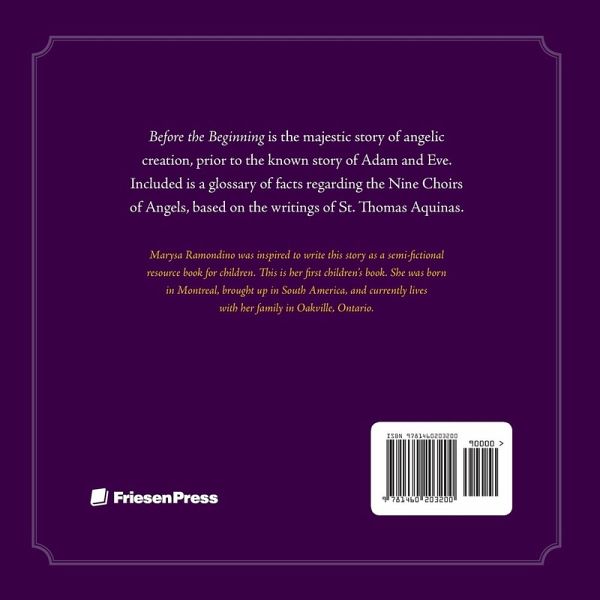 Before the Beginning is the majestic story of angelic creation, prior to the known story of Adam and Eve. Included is a glossary of facts regarding the Nine Choirs of Angels, based on the writings of St. Thomas Aquinas.