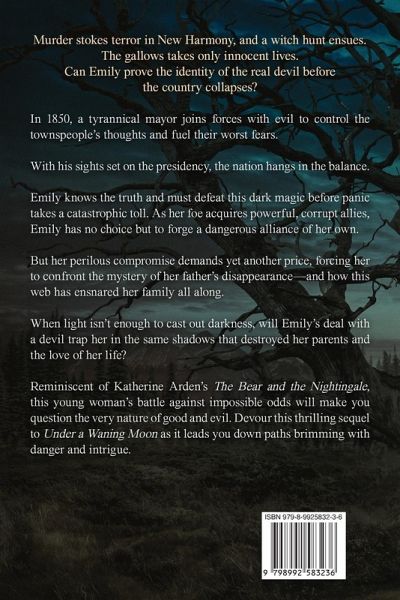 Murder stokes terror in New Harmony, and a witch hunt ensues. The gallows takes only innocent lives. Can Emily prove the identity of the real devil before the country collapses? In 1850, a tyrannical mayor joins forces with evil to control the townspeople's thoughts and fuel their worst fears. With his sights set on the presidency, the nation hangs in the balance. Emily knows the truth and must defeat this dark magic before panic takes a catastrophic toll. As her foe acquires powerful, corrupt allies, Emily has no choice but to forge a dangerous alliance of her own. But her perilous compromise demands yet another price, forcing her to confront the mystery of her father's disappearance-and how this web has ensnared her family all along. When light isn't enough to cast out darkness, will Emily's deal with a devil trap her in the same shadows that destroyed her parents and the love of her life? Reminiscent of Katherine Arden's The Bear and the Nightingale, this young woman's battle against impossible odds will make you question the very nature of good and evil. Devour this thrilling sequel to Under a Waning Moon as it leads you down paths brimming with danger and intrigue.