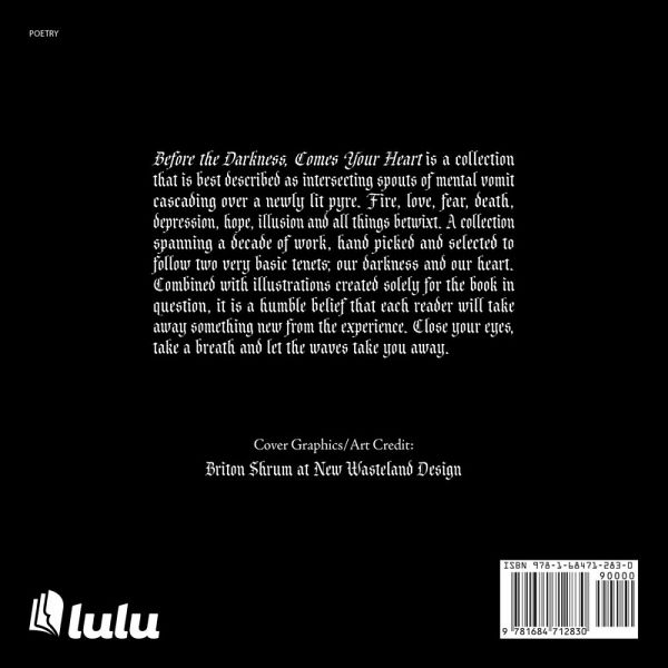 Before the Darkness, Comes Your Heart is a collection that is best described as intersecting spouts of mental vomit cascading over a newly lit pyre. Fire, love, fear, death, depression, hope, illusion and all things betwixt. A collection spanning a decade of work, hand picked and selected to follow two very basic tenets; our darkness and our heart. Combined with illustrations created solely for the book in question, it is a humble belief that each reader will take away something new from the experience. Close your eyes, take a breath and let the waves take you away.