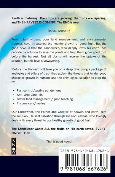 Earth is maturing. The crops are growing, the fruits are ripening, and THE HARVEST IS COMING! The END of the age is near! Do you sense it? Pests, plant viruses, poor land management, and environmental traumas have threatened the healthy growth of good fruit. But the good news is that the Landowner, who deeply loves his earth, has provided a solution to save the plants and help them grow good fruit before the harvest. Not all plants will receive the uptake of the solution, but his love is unwavering. 'Before the Harvest' will take you on a deep dive using a package of analogies and pillars of truth that explain the threats that hinder good character growth in humans and the only logical solution to stop the rot: Pest control/casting out demons Anti-virus /anti-sin Better land management / good teaching Trauma care/healing Our Landowner, the Father and Creator of heaven and earth sent the solution. He sent salvation through His Son Jesus, who lovingly deals with every threat to our healthy growth of good fruit. The Landowner wants ALL the fruits on His earth saved. EVERY. SINGLE. ONE... That is good news!