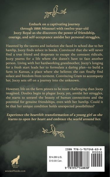 Embark on a captivating journey through 1888 Missouri with twelve-year-old Jocey Royal as she discovers the power of friendship, courage, and self-acceptance amidst her personal struggles. Haunted by the taunts and isolation she faced in school due to her harelip, Jocey finds solace in books, where dreams take flight. Convinced that she will never find a true friend and desperate to escape the constant ridicule, Jocey yearns for a life where she doesn't have to face another person. Living with her hardworking grandmother, Jocey's longing for a fresh start leads her to formulate a daring plan-to build a farm in Kansas, a place where she believes she can finally find solace and freedom from torment. Convincing Gram to accompany her, Jocey sets off on a journey into the unknown. However, life on the farm proves to be more challenging than Jocey imagined. Hard work is expected, but she soon realizes that avoiding neighbors and traveling salesmen is impossible. Complicating matters, Gram's determination to act as an invalid adds another layer of complexity to Jocey's quest for peace. Doubts begin to plague Jocey, yet, amidst her struggles, she starts to unravel the beauty of human connections and the potential for genuine friendships, even with her harelip. Could it be that her unique condition holds unexpected possibilities. Experience the heartfelt transformation of a young girl as she learns to open her heart and embrace the world around her. Will Jocey find the acceptance she craves and discover that her harelip doesn't define her? Delve into this inspiring tale of resilience, hope, and the remarkable power of self-discovery today.