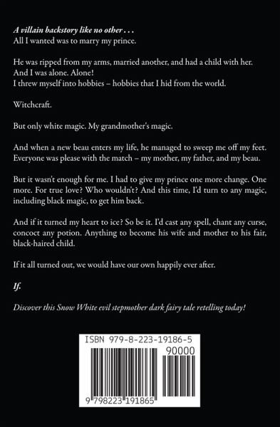 A villain backstory like no other . . . All I wanted was to marry my prince. He was ripped from my arms, married another, and had a child with her. And I was alone. Alone! I threw myself into hobbies - hobbies that I hid from the world. Witchcraft. But only white magic. My grandmother's magic. And when a new beau enters my life, he managed to sweep me off my feet. Everyone was please with the match - my mother, my father, and my beau. But it wasn't enough for me. I had to give my prince one more change. One more. For true love? Who wouldn't? And this time, I'd turn to any magic, including black magic, to get him back. And if it turned my heart to ice? So be it. I'd cast any spell, chant any curse, concoct any potion. Anything to become his wife and mother to his fair, black-haired child. If it all turned out, we would have our own happily ever after. If. Discover this Snow White evil stepmother dark fairy tale retelling today!