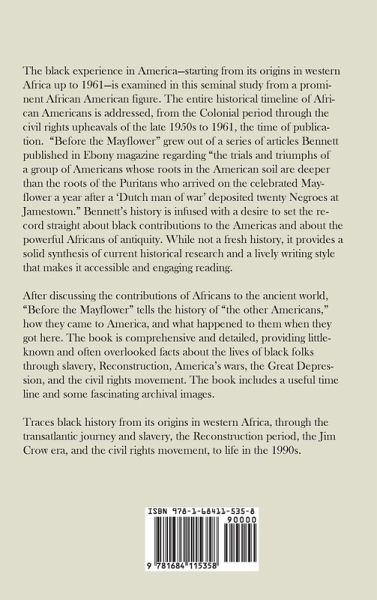 The black experience in America-starting from its origins in western Africa up to 1961-is examined in this seminal study from a prominent African American figure. The entire historical timeline of African Americans is addressed, from the Colonial period through the civil rights upheavals of the late 1950s to 1961, the time of publication. "Before the Mayflower" grew out of a series of articles Bennett published in Ebony magazine regarding "the trials and triumphs of a group of Americans whose roots in the American soil are deeper than the roots of the Puritans who arrived on the celebrated Mayflower a year after a 'Dutch man of war' deposited twenty Negroes at Jamestown." Bennett's history is infused with a desire to set the record straight about black contributions to the Americas and about the powerful Africans of antiquity. While not a fresh history, it provides a solid synthesis of current historical research and a lively writing style that makes it accessible and engaging reading. After discussing the contributions of Africans to the ancient world, "Before the Mayflower" tells the history of "the other Americans," how they came to America, and what happened to them when they got here. The book is comprehensive and detailed, providing little-known and often overlooked facts about the lives of black folks through slavery, Reconstruction, America's wars, the Great Depression, and the civil rights movement. The book includes a useful time line and some fascinating archival images.