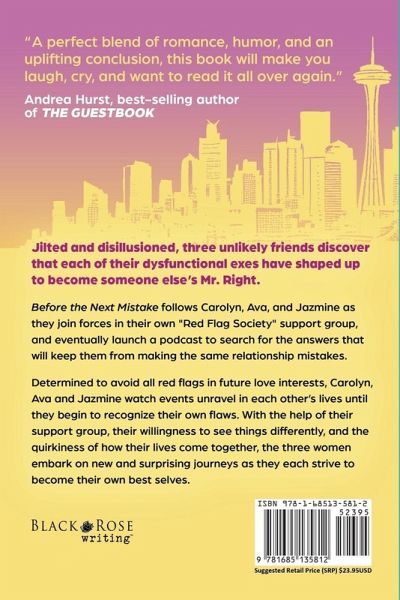"A perfect blend of romance, humor, and an uplifting conclusion, this book will make you laugh, cry, and want to read it all over again." -Andrea Hurst, best-selling author of The Guestbook Jilted and disillusioned, three unlikely friends discover that each of their dysfunctional exes have shaped up to become someone else's Mr. Right. Before the Next Mistake follows Carolyn, Ava, and Jazmine as they join forces in their own "Red Flag Society" support group, and eventually launch a podcast to search for the answers that will keep them from making the same relationship mistakes. Determined to avoid all red flags in future love interests, Carolyn, Ava and Jazmine watch events unravel in each other's lives until they begin to recognize their own flaws. With the help of their support group, their willingness to see things differently, and the quirkiness of how their lives come together, the three women embark on new and surprising journeys as they each strive to become their own best selves.