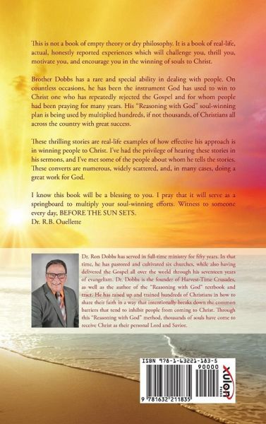 This is not a book of empty theory or dry philosophy. It is a book of real-life, actual, honestly reported experiences which will challenge you, thrill you, motivate you, and encourage you in the winning of souls to Christ.Brother Dobbs has a rare and special ability in dealing with people. On countless occasions, he has been the instrument God has used to win to Christ one who has repeatedly rejected the Gospel and for whom people had been praying for many years. His "Reasoning with God" soul-winning plan is being used by multiplied hundreds, if not thousands, of Christians all across the country with great success.These thrilling stories are real-life examples of how effective his approach is in winning people to Christ. I've had the privilege of hearing these stories in his sermons, and I've met some of the people about whom he tells the stories. These converts are numerous, widely scattered, and, in many cases, doing a great work for God.I know this book will be a blessing to you. I pray that it will serve as a springboard to multiply your soul-winning efforts. Witness to someone every day, BEFORE THE SUN SETS.Dr. R.B. Ouelette Dr. Ron Dobbs has served in full-time ministry for fifty years. In that time, he has pastored and cultivated six churches, while also having delivered the Gospel all over the world through his seventeen years of evangelism. Dr. Dobbs is the founder of Harvest-Time Crusades, as well as the author of the "Reasoning with God" textbook and tract. He has raised up and trained hundreds of Christians in how to share their faith in a way that intentionally breaks down the common barriers that tend to inhibit people from coming to Christ. Through this "Reasoning with God" method, thousands of souls have come to receive Christ as their personal Lord and Savior.